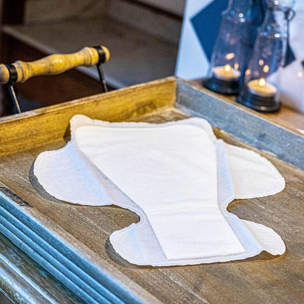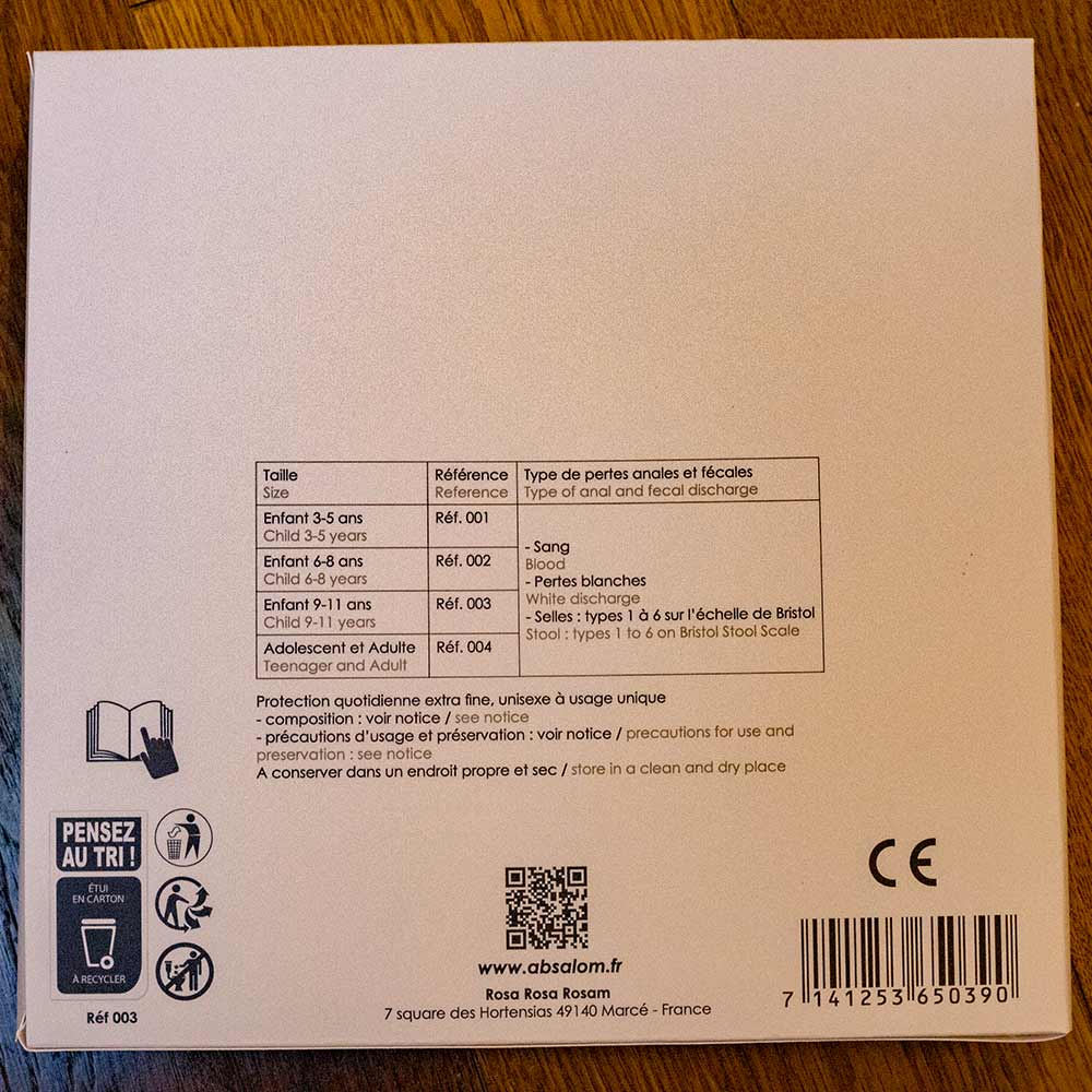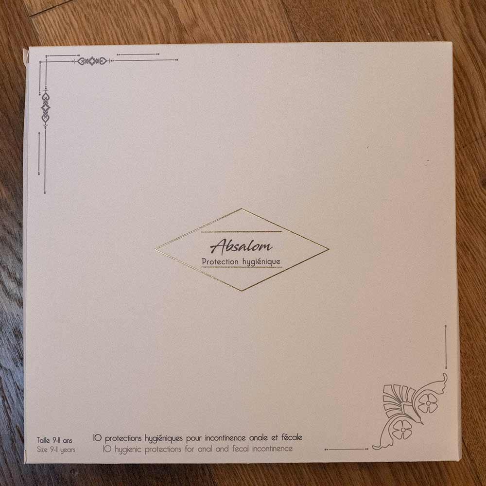 Protection hygiénique enfant extra fine, unisexe, à usage unique. Elle s’adapte directement aux sous-vêtements et se compose d’un corps central dont la partie la plus large est destinée à protéger les fesses et de deux paires d’ailettes latérales. Les ailettes et le corps central de la protection sont dotés d’un adhésif. Enlever la protection en papier pour révéler la partie collante. Cette protection hygiénique enfant est un atout majeur pour gérer l’incontinence anale et fécale , ponctuelle ou permanente, allant de la simple souillure à la perte de matière (fécale, sang, perte blanche). Absalom® s’adapte aussi aux adultes et aux adolescents.